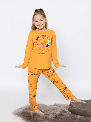 Комбинированная пижама из джемпера и брюк. Джемпер гладкокрашенный, свободного покроя с длинным рукавом. Горловина обработана притачной бейкой из рибаны с лайкрой. Перед оформлен принтом. Прямые брюки умеренного объёма выполнены из набивного полотна. Цельнокроенный пояс обработан плоским швом вподгибку с одновременным прокладыванием резинки.