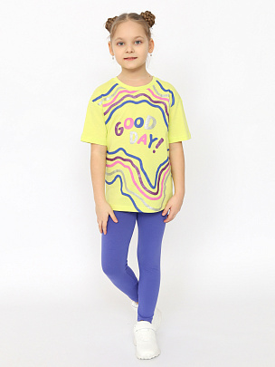 Трикотажная футболка оверсайз для девочки выполнена из мягкого хлопкового трикотажа. Свободный силуэт с заниженной линией плеча не сковывает движения. Модель дополнена круглым вырезом горловины и короткими рукавами. Перед декорирован ярким принтом с блестящим эффектом (надпись: Хорошего дня). Мягкие и комфортные лосины средней посадки с поясом на резинке.