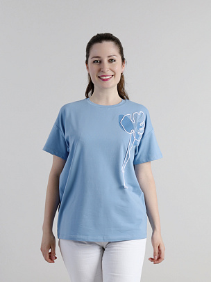 Футболка прямого силуэта длиной по  линию бедер. Короткий рукав. Круглая горловина обработана узкой  притачной обтачкой из рибаны с эластаном. Полочка декорирована вышивкой "никогда не переставай мечтать".