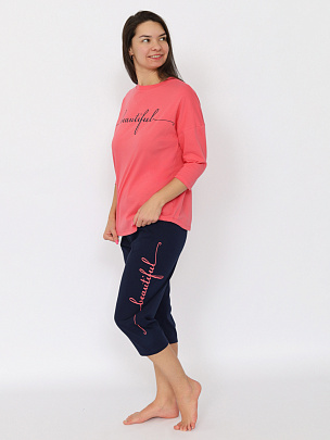 Гладкокрашенная пижама из джемпера и бридж. Джемпер свободного покроя с рукавом 3/4. Горловина обработана притачной бейкой из рибаны с лайкрой. Перед оформлен принтом. Бриджи прямые умеренного объёма длиной ниже колена выполнены из полотна дополнительного цвета. Цельнокроенный пояс обработан плоским швом вподгибку с одновременным прокладыванием резинки. На левой стороне - принт.