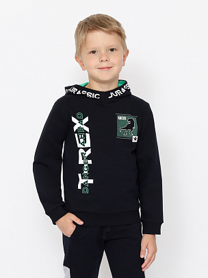 Толстовка для мальчика с капюшоном со шнурком, карман-кенгуру. Манжеты и пояс из эластичной рибаны. На рукаве декоративная силиконовая нашивка.