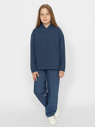 Трикотажный детский джемпер для девочек из набивного футера - имитирует костюмную ткань, с воротником-стойкой. Свитшот имеет спущенные рукава и свободный силуэт. Боковые швы переходят на перед. На рукавах и снизу толстовка отделана манжетами и поясом из основного полотна. Спереди декоративный металлический лейбл.