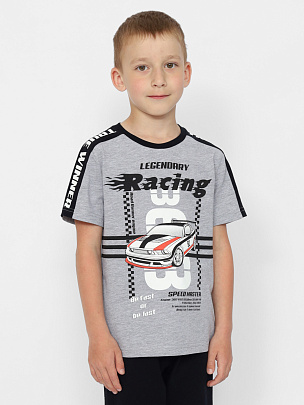 Комбинированная футболка с короткими рукавами. Горловина круглая, обработана узким воротником из полотна с эластаном. Перед футболки с горизонтальным швом чуть ниже линии груди. Перед футболки декорирован принтом "время машин". Шорты с боковыми карманами. Пояс притачной, с резинкой внутри и шнуром.